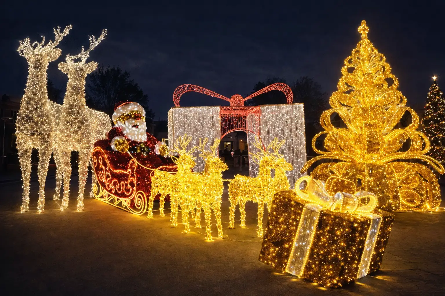 Gift Christmas Boxes are small, modular luminaires that build layer and depth. Arranged in groups of varying sizes around larger installations, they provide foreground interest and scale. Their modularity allows creative patterns — stacked, staggered, or lining pathways — and they’re economical to maintain. Use them to guide sightlines toward primary features like the Golden Christmas Tree or Santa’s Sleigh.