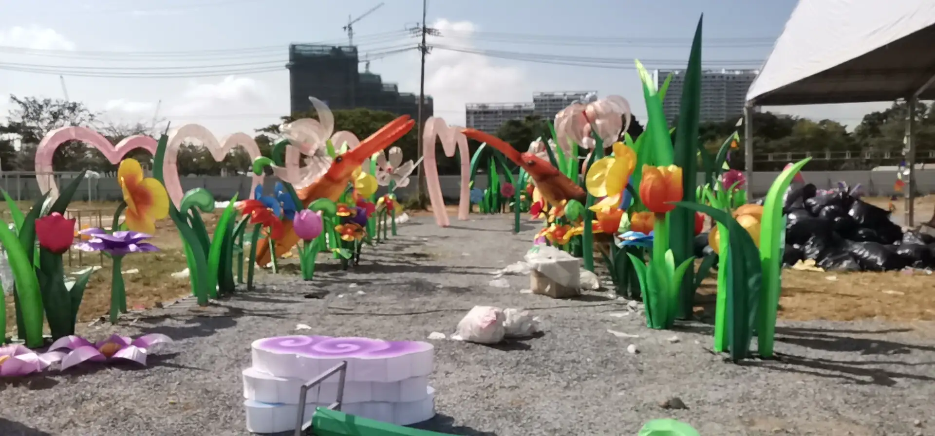 In this Vietnam project, these large-scale lantern structures served as landmark features. They helped anchor the entire site and provided contrast to the softer elements such as flowers and cartoon figures.
