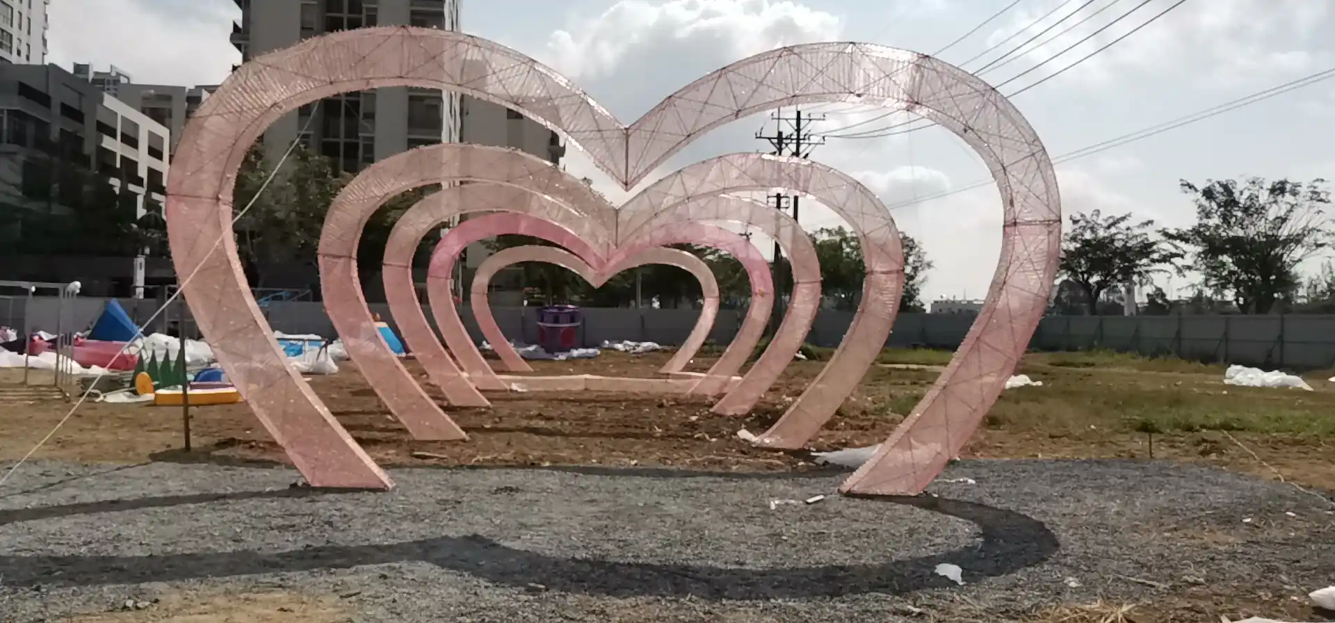 In large festival lighting projects, this type of structure is widely used because it provides clear direction, strong symbolic meaning, and high visual recognition. In this case, the heart tunnel introduced a romantic theme that balanced the other areas of the site.