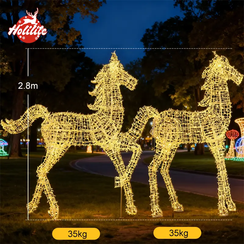 These illuminated horse sculptures create strong visual impact in a wide range of outdoor settings, enhancing both festive and everyday environments.