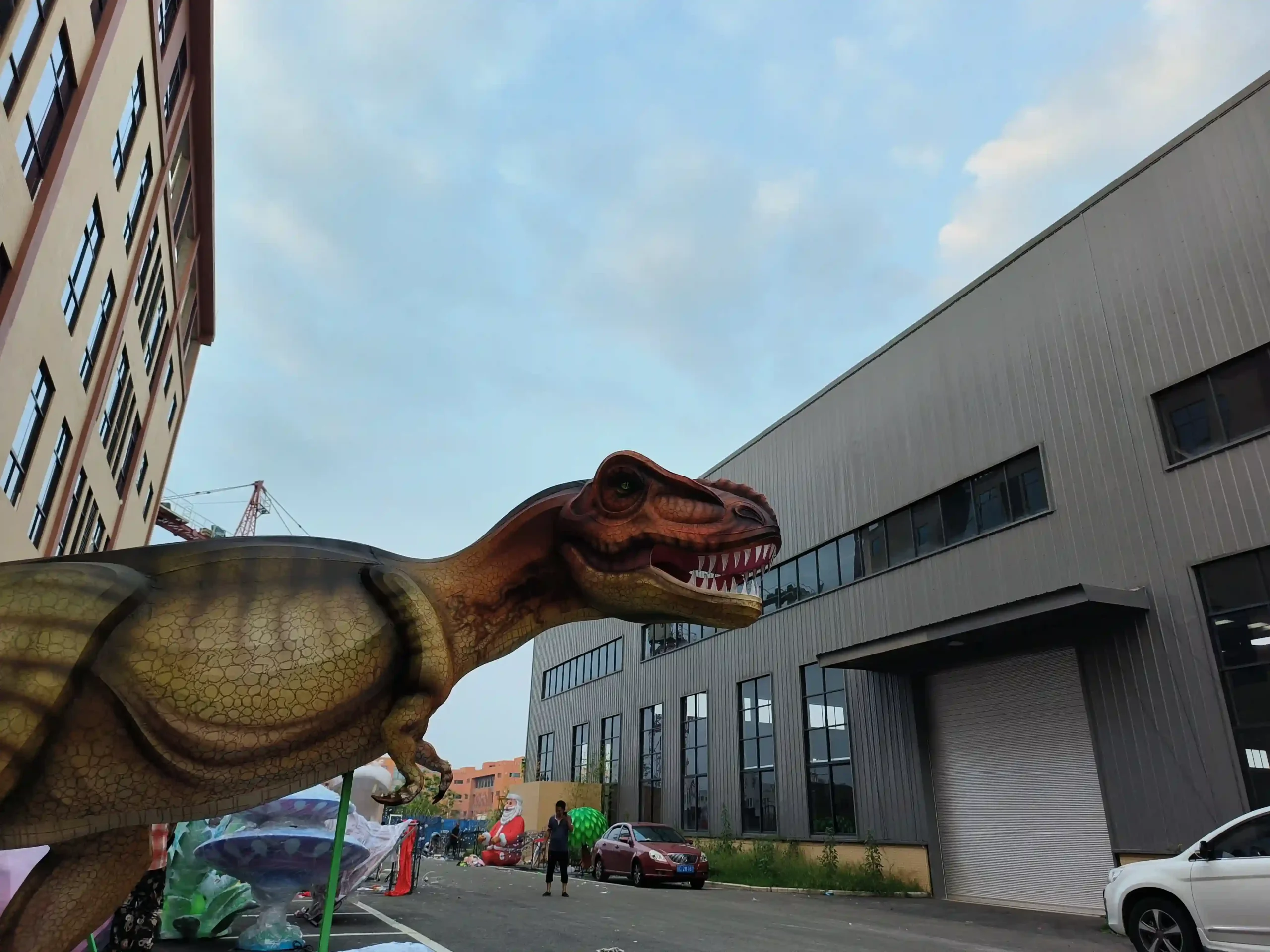 En las fotos de producción se aprecia claramente la escala real del dinosaurio. Comparado con las personas y los objetos circundantes, su tamaño es lo bastante grande como para crear un fuerte impacto visual en entornos abiertos.