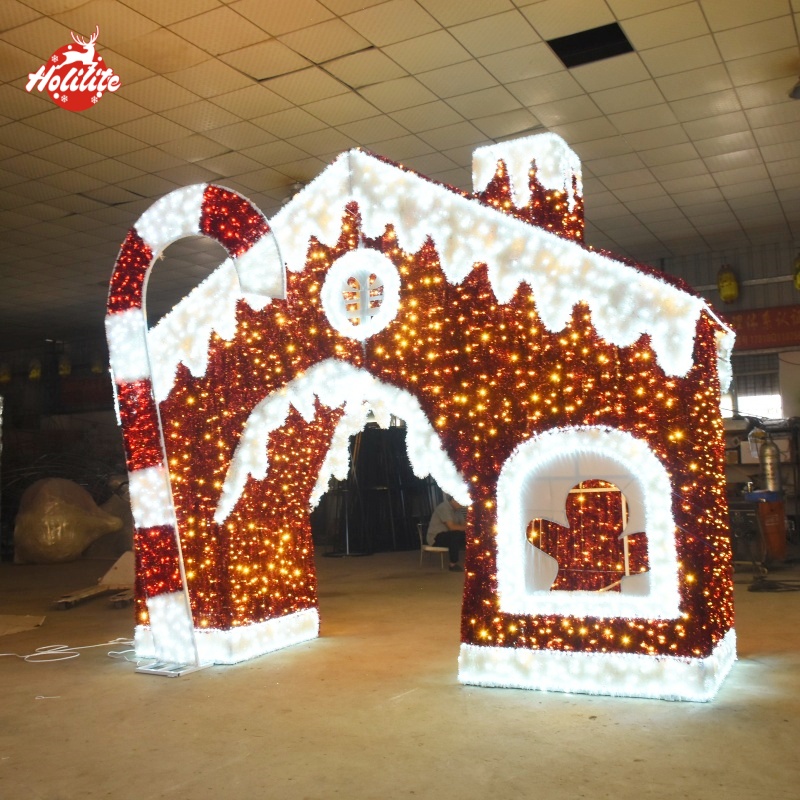 En Gran escultura luminosa de una casa de jengibre de HOLILITE es una decoración navideña de exterior de primera calidad diseñada para crear entornos festivos envolventes e inspirados en historias. Inspirada en las clásicas casas de jengibre navideñas, esta estructura iluminada combina un diseño divertido con una durabilidad industrial, lo que la hace ideal para instalaciones navideñas comerciales a gran escala.